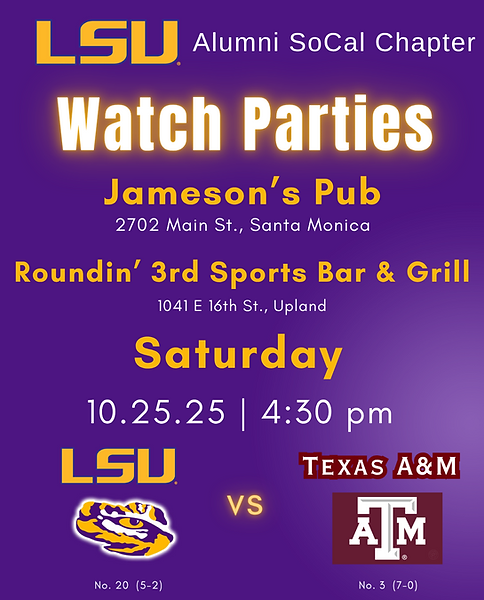 We have multiple watch party locations throughout Southern California for all of the LSU football season. Come out and watch and cheer on our Tigers with fellow fans. (Click on the Locations' names to link to a map & site info.)